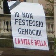 Fuori programma al Pantheon, durante le celebrazioni per il 150esimo anniversario dell'unità d'Italia. Subito dopo l'ingresso delle autorità, da un balcone di piazza della Rotonda è stato infatti issato un grosso manifesto con la scritta "Io non festeggio genocidi, la vita è bella", fatto togliere, un po' bruscamente, da un uomo della sicurezza dopo pochi minuti.