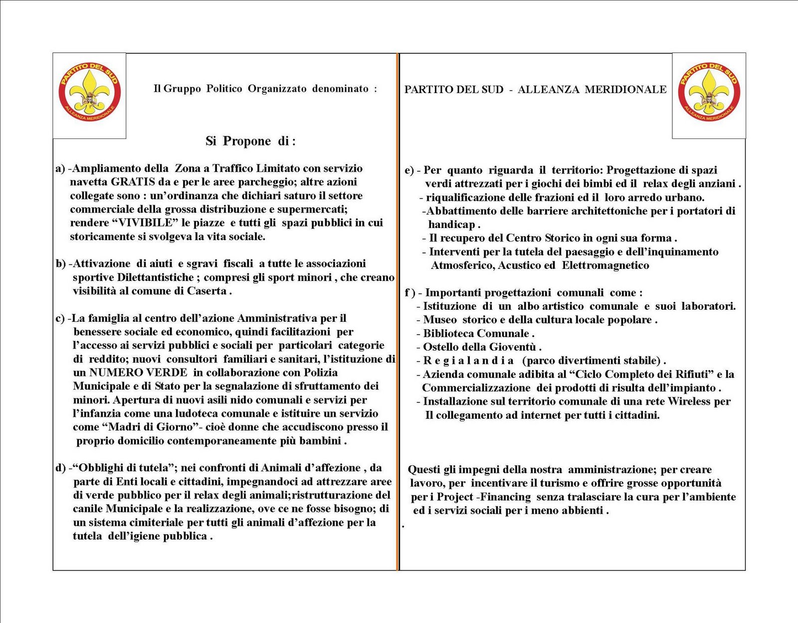PARTITO DEL SUD CASERTA: PUNTI PRINCIPALI DEL PROGRAMMA COMUNALI 2011