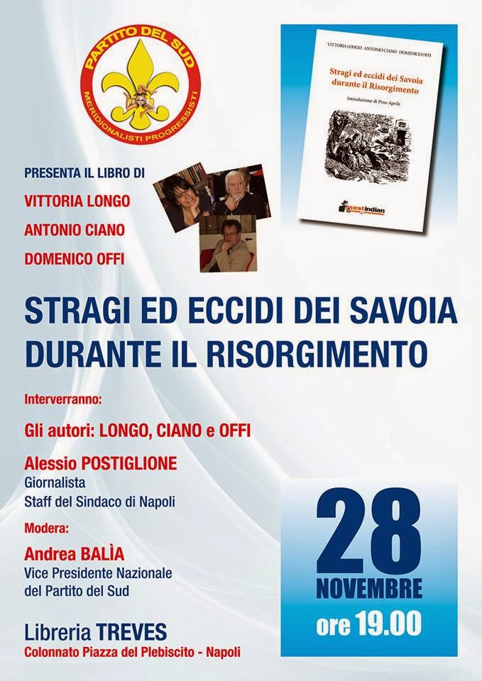 Davanti a un folto e attento uditorio in un confronto di riflessioni critiche sul tema in questione tra gli autori e le argute osservazioni del giornalista Alessio Postiglione (Staff del Sindaco di Napoli Luigi de Magistris), moderati da Andrea Balìa (Vice Presidente Nazionale del Partito del Sud) c'è stato l'esordio a Napoli del libro "Stragi ed eccidi dei Savoia durante il Risorgimento".