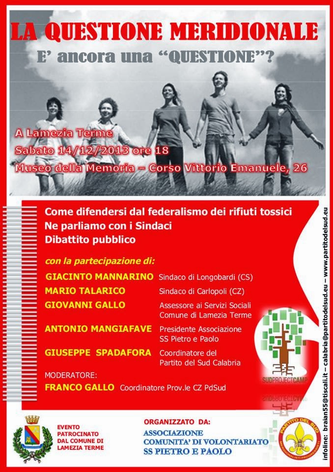 LA QUESTIONE MERIDIONALE E' ANCORA UNA "QUESTIONE"? - Nel 2013, in piena crisi economica, la questione meridionale è ancora una "QUESTIONE"? Come ci difendiamo dal federalismo dei rifiuti tossici? Ne parliamo con i Sindaci in un dibattito pubblico."