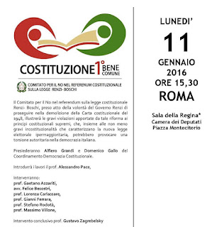 Per denunciare questo stato di cose l’11 gennaio 2016 alle ore 15 alla Camera dei Deputati, Piazza Montecitorio – Roma nella Sala della Regina si andrà a costituire il COMITATO PER IL NO NEL REFERENDUM COSTITUZIONALE SULLA LEGGE RENZI-BOSCHI.