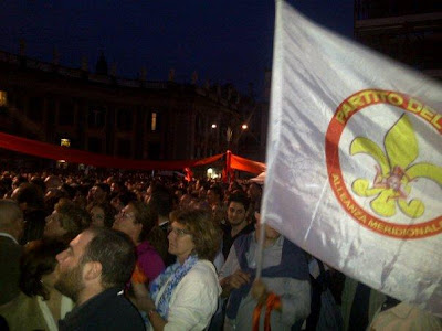 La bandiera del Partito del Sud sotto il palco di Luigi de Magistris assieme a quelle delle altre formazioni che stanno appoggiando il candidato sindaco per Napoli.domenica 22 maggio 2011